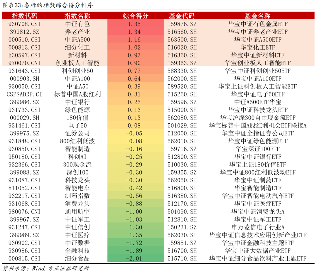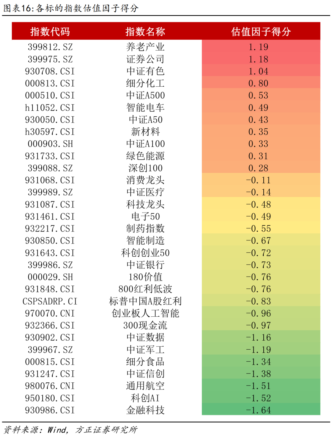 根据最新宏观环境下估值因子得分,养老产业、证券公司、中证有色、细分化工等指数得分较高。