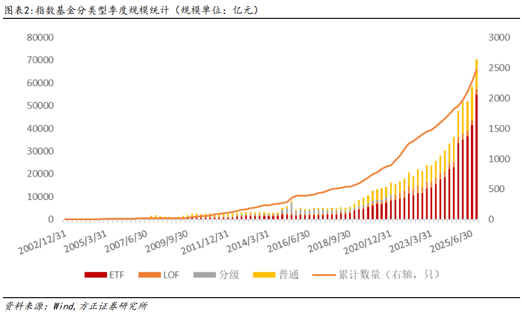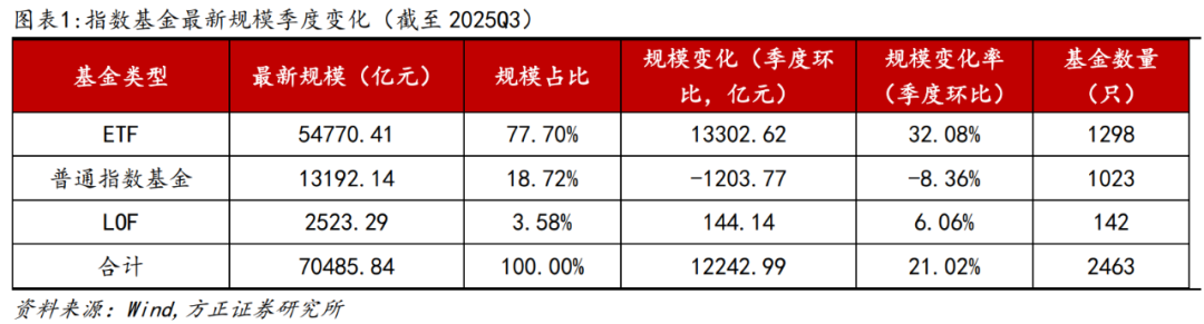 自国内首只指数基金于2002年成立以来,国内指数基金业务发展迅速,特别是自2018年以来,随着ETF市场的快速发展,指数基金规模大幅增长。截至2025年三季度末,国内指数基金数量达到2463只,规模合计70485.84亿元,其中ETF产品数量1298只,规模合计54770.41亿元,占全部指数基金总规模的77.70%。