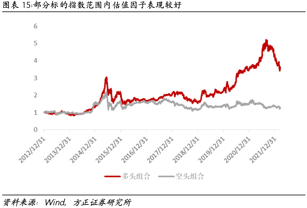 基于估值因子的上述表现特征,我们根据宏观经济周期对估值因子进行选择,当进入宽货币宽信用周期,我们选择估值分位数因子,当市场进入宽货币紧信用、紧货币宽信用、紧货币紧信用等周期时,我们选择PEG因子来构建估值因子,并在部分指数产品的标的指数范围内测试其表现,可以看到长期来看,在特定指数范围内估值因子表现出了较好的分化特征。