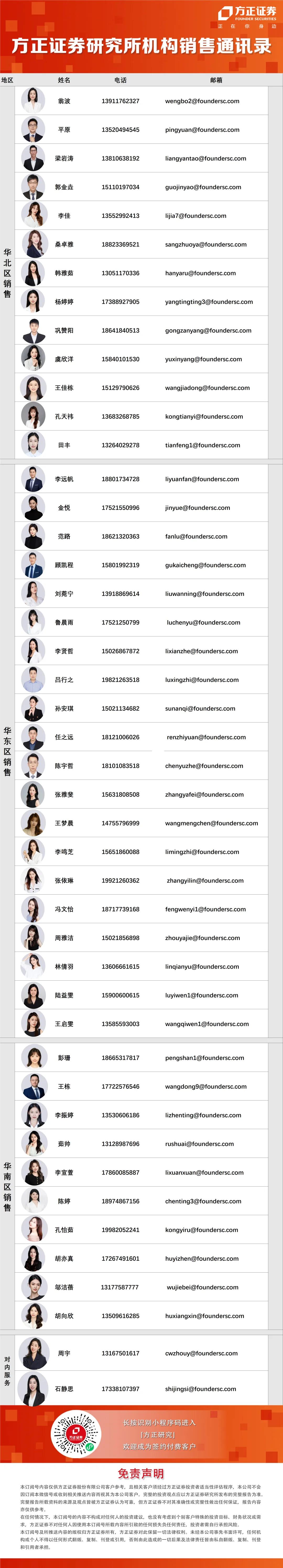本研究报告由方正证券制作及在中国(香港和澳门特别行政区、台湾省除外)发布。根据《证券期货投资者适当性管理办法》,本报告内容仅供我公司适当性评级为 C3 及以上等级的投资者使用,本公司不会因接收人收到本报告而视其为本公司的当然客户。若您并非前述等级的投资者,为保证服务质量、控制风险,请勿订阅本报告中的信息,本资料难以设置访问权限,若给您造成不便,敬请谅解。 在任何情况下,本报告的内容不构成对任何人的投资建议,也没有考虑到个别客户特殊的投资目标、财务状况或需求,方正证券不对任何人因使用本报告所载任何内容所引致的任何损失负任何责任,投资者需自行承担风险。 本报告版权仅为方正证券所有,本公司对本报告保留一切法律权利。未经本公司事先书面授权,任何机构或个人不得以任何形式复制、转发或公开传播本报告的全部或部分内容,不得将报告内容作为诉讼、仲裁、传媒所引用之证明或依据,不得用于营利或用于未经允许的其它用途。如需引用、刊发或转载本报告,需注明出处且不得进行任何有悖原意的引用、删节和修改。