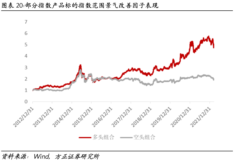 我们根据所处的宏观环境,对细分因子进行因子选择和合成,可以看到,合成之后的基本面景气改善因子长期表现非常出色,在部分指数产品范围内多空组合分化非常明显。