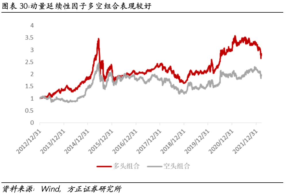 从多空分组表现来看,动量延续性因子表现较为出色,在部分指数产品标的指数内多空分化明显。