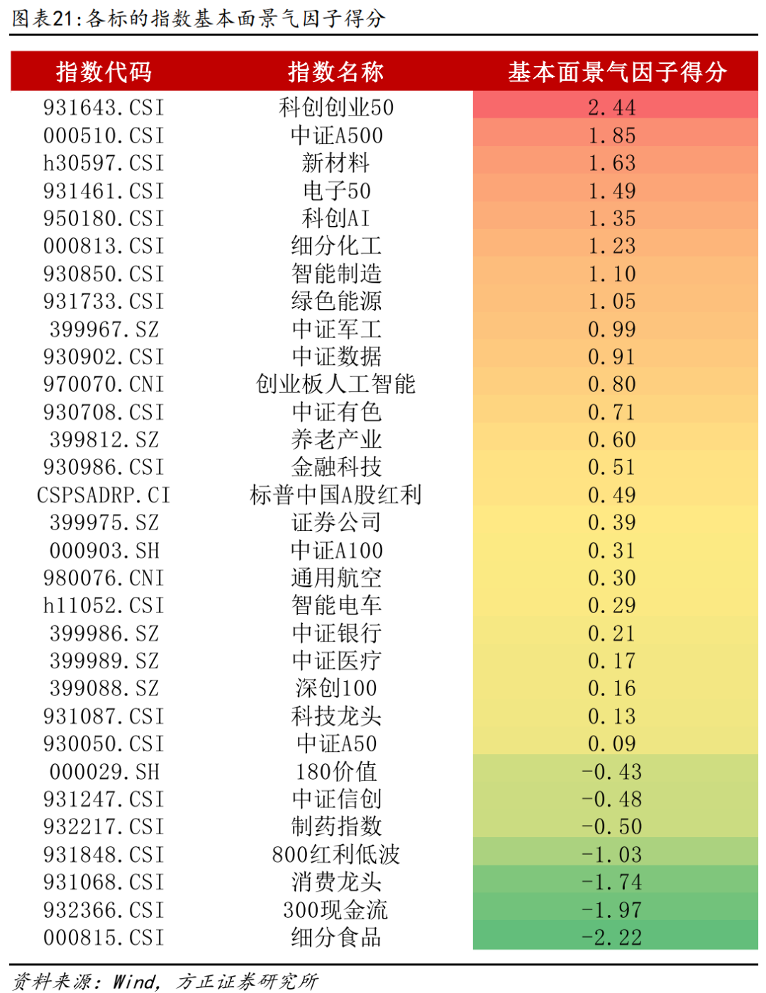 截至2025年11月底,根据最新基本面景气因子得分,科创创业50、中证A500、新材料、电子50等指数得分较高。