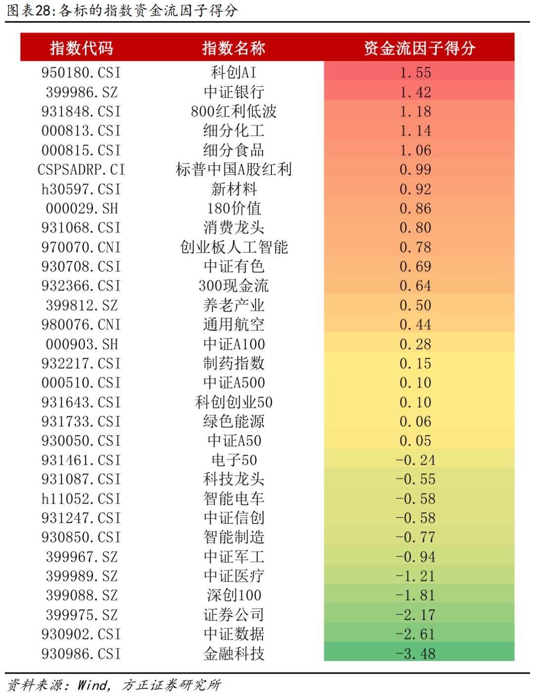 截至2025年11月底,根据最新资金流因子得分,科创AI、中证银行、800红利低波、细分化工等指数得分较高。