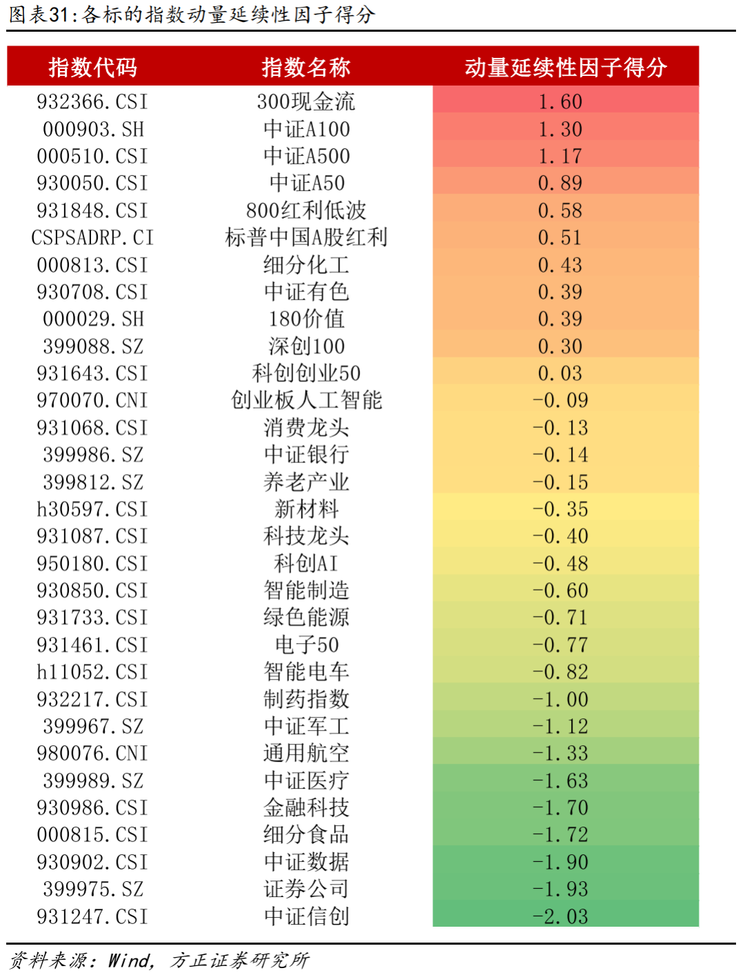 截至2025年11月底,根据最新动量延续性因子得分,300现金流、中证A100、中证A500、中证A50等指数得分较高。