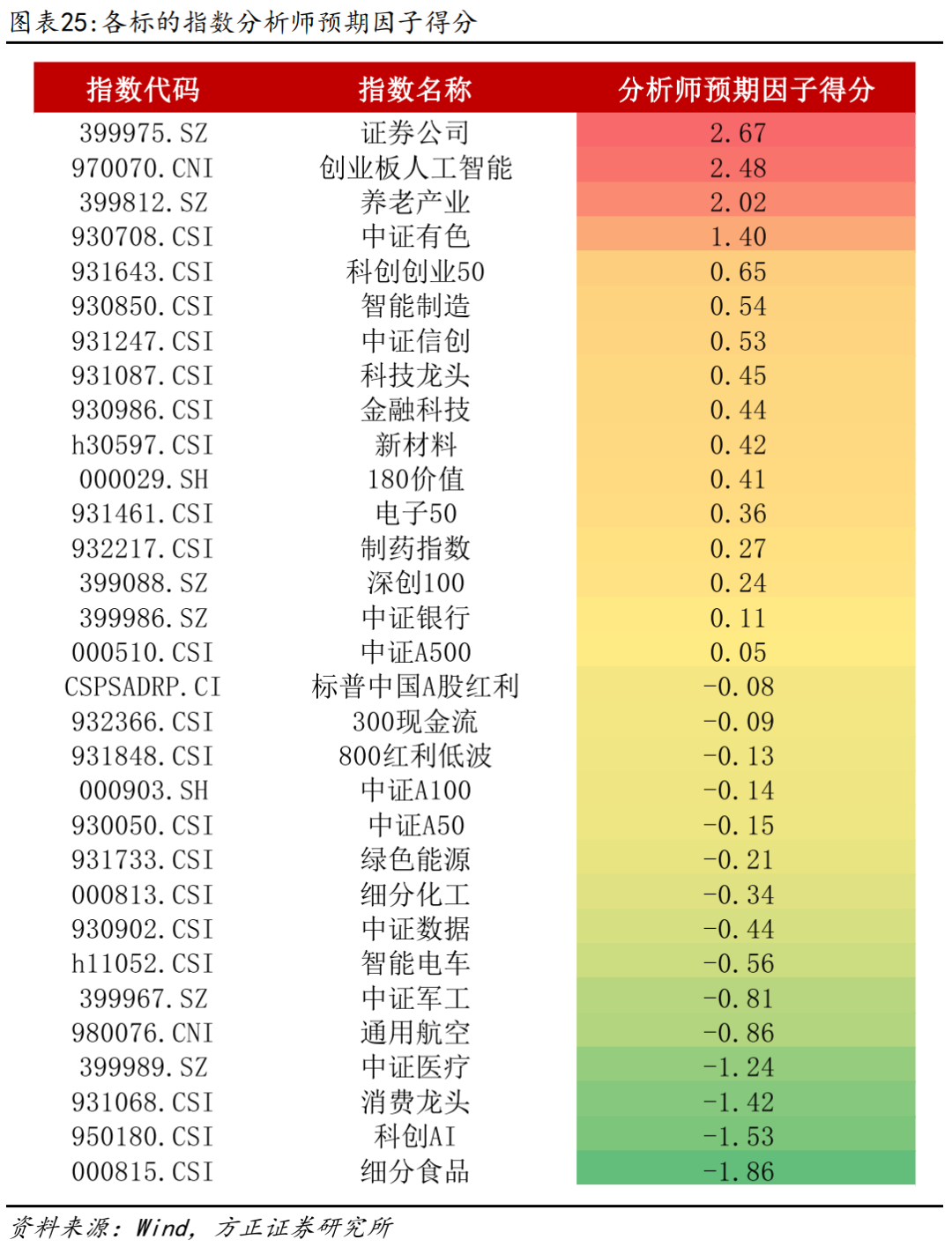 截至2025年11月底,根据最新分析师预期因子得分,证券公司、创业板人工智能、养老产业、中证有色等指数得分较高。