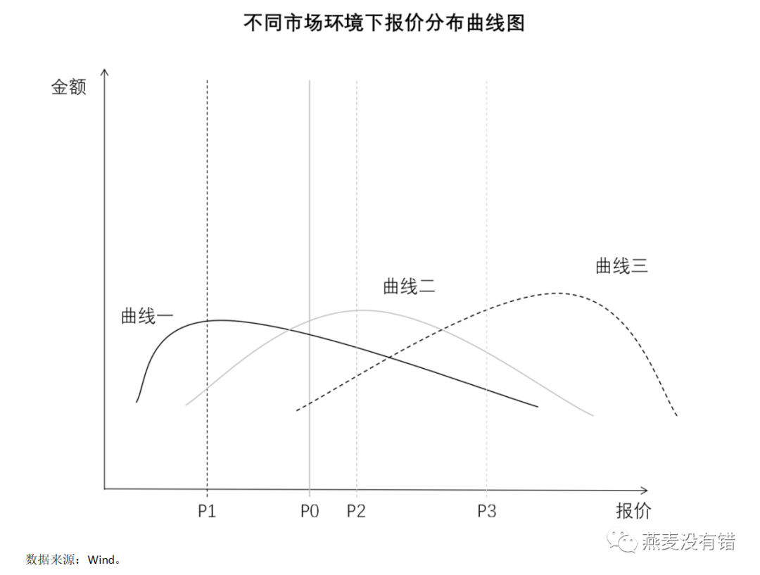 随着市场关注度进一步提升(如2016年时,参与者发现低报价无法中标,非理性地提高了自己的预期),参与者倾向于抬高自己的报价。与此同时,部分上市公司抓住了市场中存在的投机心态,通过与投资者深度沟通及一系列资本运作手段,进一步提升了部分投资者的风险偏好,变相抬高二级市场价格,导致报价分布曲线右偏严重(如图曲线三所示)。最终发行价可能进一步提升至P3,该价格已经远远高于合理价格P0。