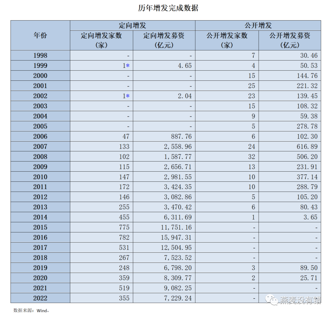 *注释:有很多说法认为1998年7月中国证监会试点的是公开增发,定向增发要等到2006年5月《上市公司证券发行管理办法》之后才诞生。实际上,这种看法不够准确。有资料显示,1999-2005年间采用类似非公开方式增发的企业就包括大众交通(1999)、东软股份(1999)、京山轻机(2002)、中国重汽(2003)、武钢股份(2004)、宝钢股份(2005)等数个案例。而根据Wind提供索引的两条数据来看,1999年12月大众出租(现大众交通)即是定向增发法人股实现重组,而2002年1月京山轻机增发 A 股获得证监会核准。只不过从增发公告内容看,那时还不叫“非公开增发(定向增发)”,而是称之为“老股东上网定价配售”。