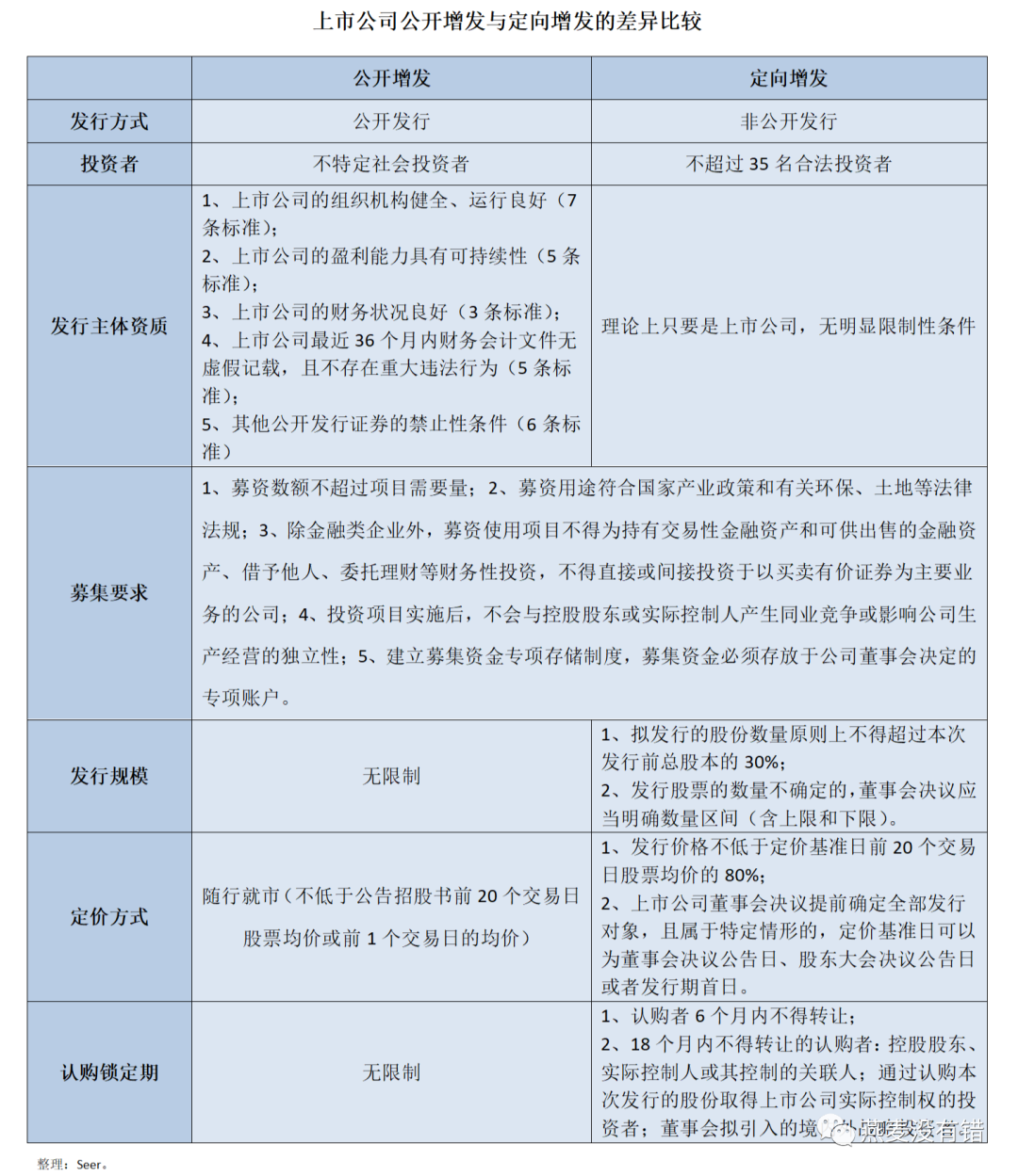 从比较可以看出,相比于公开增发,定向增发的条件更为简单,在财务门槛、盈利能力、发行条件、发行价格方面优势明显,这就造成了发行主体更倾向于采用定向增发方式。
