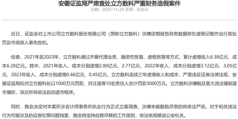 同时,在证监会官网发布了《安徽证监局严肃查处立方数科严重财务造假案件》。