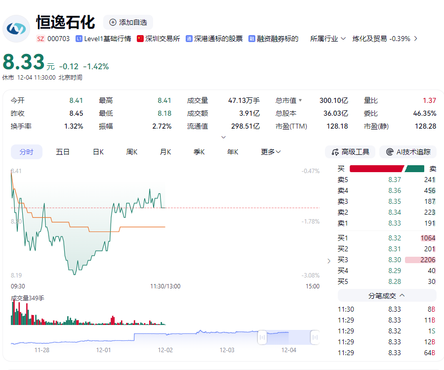 二级市场上,12月4日,截至发稿,恒逸石化股价报8.33元/股,跌1.42%,最新市值约300.1亿元。