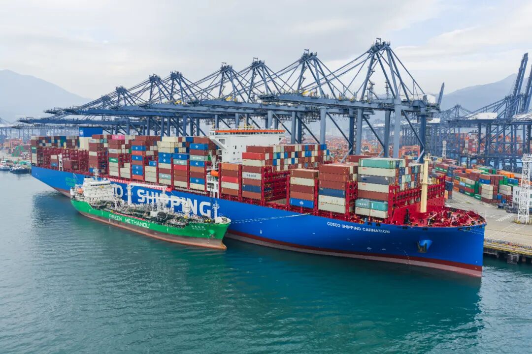 12月3日,中远海运集运、中国船燃、深圳港集团,共同在深圳盐田港成功为甲醇双燃料动力集装箱船“中远海运康乃馨”轮,加注国产绿色甲醇燃料。