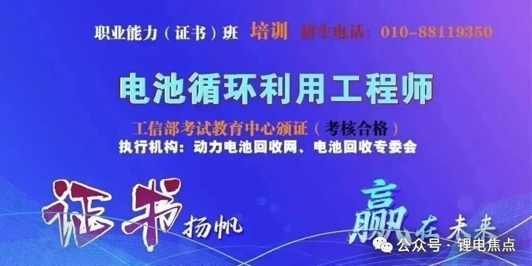 本站记者从动力电池回收网、中国电子节能技术协会电池回收利用委员会获悉,由工信部考试教育中心推出的《电池循环利用工程师》职业能力证书培训已经开始招生啦,通过考核后学员将取得《电池循环利用工程师》职业能力等级评价证书。培训时间:12月11-12日,培训地点:武汉市。