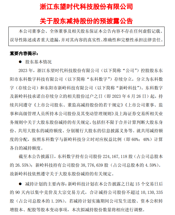 12月4日,东望时代(600052.SH)发布公告,新岭科技计划在公告披露之日起15个交易日后的90天内以集中竞价及大宗交易方式,合计减持公司股份不超过1013.03万股(占公司总股本的1.20%)。