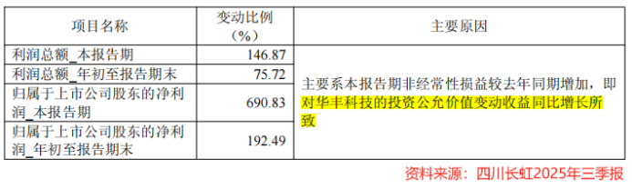 2025年前三季度,四川长虹持有的华丰科技股权所带来的公允价值变动收益,高达9.97亿元,贡献了99%的净利润。
