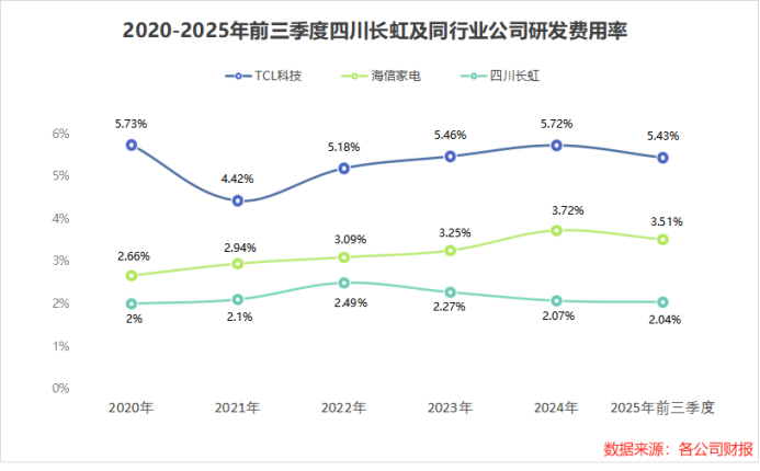 2020年到2025年上半年,四川长虹研发费用率始终维持在2%左右,显著低于海信家电、TCL科技等同行。