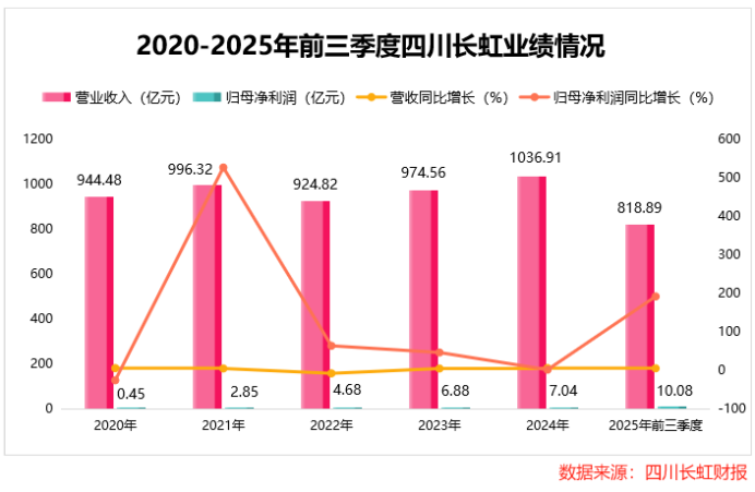 2025年前三季度,四川长虹实现营收818.89亿元,同比增长5.94%;净利润10.08亿元,同比飙升192.49%。