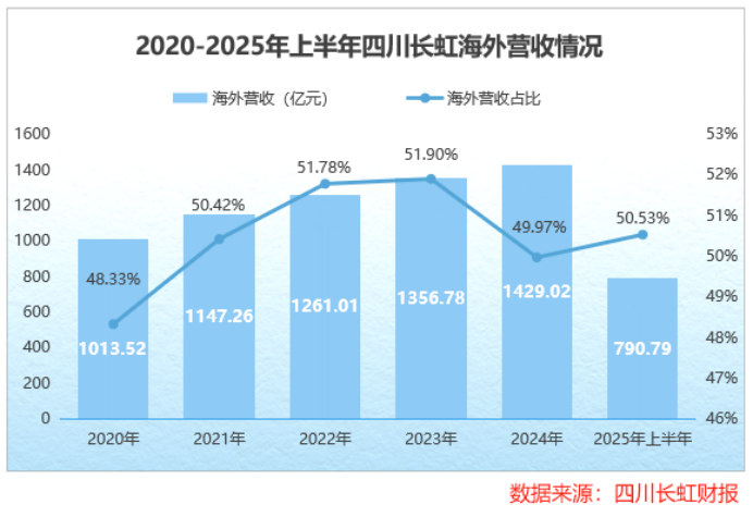 2025年上半年,四川长虹海外营收达790.8亿元,同比增长12%,营收占比达50.5%,海外市场开拓成效显著。