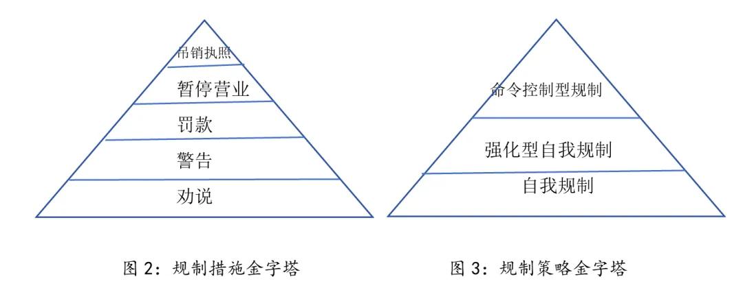 立足道德性、协商性,回应性监管理论发展出过责相当、手段和目的统一的规制系统。该理论认为,公私混合的规制体系会比单纯使用政府管制或完全依靠市场调节取得更好的效果。要根据不同的产业结构、市场主体的动机和自我规制的能力以及不同的时机,而采用不同程度的干预和不同的规制措施,此即针锋相对法(tit-for-tat)。作者把回应性规制方法概括和描述为 “金字塔” 理论,包括 “规制措施金字塔” 和 “规制策略金字塔”。多数的政府措施应该是位于 “强制金字塔” 底端的教育、说服,再根据情况而升级到警告、罚款、暂停营业乃至于最严厉的吊销执照。从策略角度,政府首先应该鼓励行业自我规制,当自我规制达不到预期效果时,政府将采用强化型自我规制(enforced self regulation),比如企业根据自己的情况来制定规则,但要接受政府的审批和监督(合规机制),如果这种强化型自我规制还不能奏效的话,政府就会采取传统的命令控制型规制。²⁴这种措施、策略所形成的管制体系有很强的针对性、适应性,因为其考虑到了博弈过程形成和维护合作的成本收益问题以及个人或企业的复杂动机:双方都先采取合作的姿态,直到有一方背弃了这种合作关系,另一方再采用惩罚的报复手段,从而使双方又回到合作的态势并重建合作型关系。