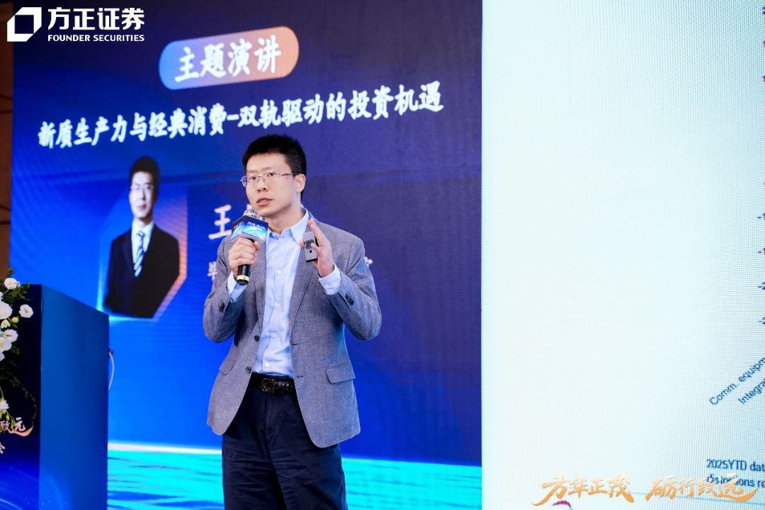 作为私募基金大会,方正证券邀请了毕盛投资和蒙玺投资两位大咖进行主题演讲。毕盛投资首席投资官王康宁在《新质生产力与经典消费:双轨驱动的投资机遇》演讲中指出,中国经济已步入“后地产时代”,增长范式发生深刻转变,呈现明显的“双轨分化”:传统地产链相关指标走弱,而通信设备、集成电路、电子商务等新经济领域保持高增长。