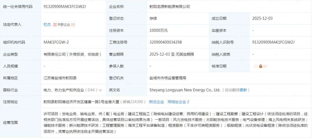 风电头条获悉,近日,射阳龙源新能源有限公司成立,注册资本1亿元。经营范围包含:风力发电技术服务;太阳能发电技术服务;电气设备修理;海上风电相关系统研发等。