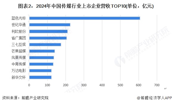 我国传媒上市企业数量众多。目前我国资本充足的大型传媒企业集团在行业企业竞争中较具优势,行业内营业收入相对较多的三家企业为蓝色光标、利欧股份、三七互娱,2024年三家企业营业收入均超过170亿元。