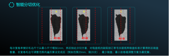 对于尺寸较大且需连续剔除多盘的纸病,根据报表数据关联订单质检标准,输入分切参数后,通过遍历算法在毛边调整范围内自动计算最少剔盘的最优方案,可以减少剔盘量,提高成品率。