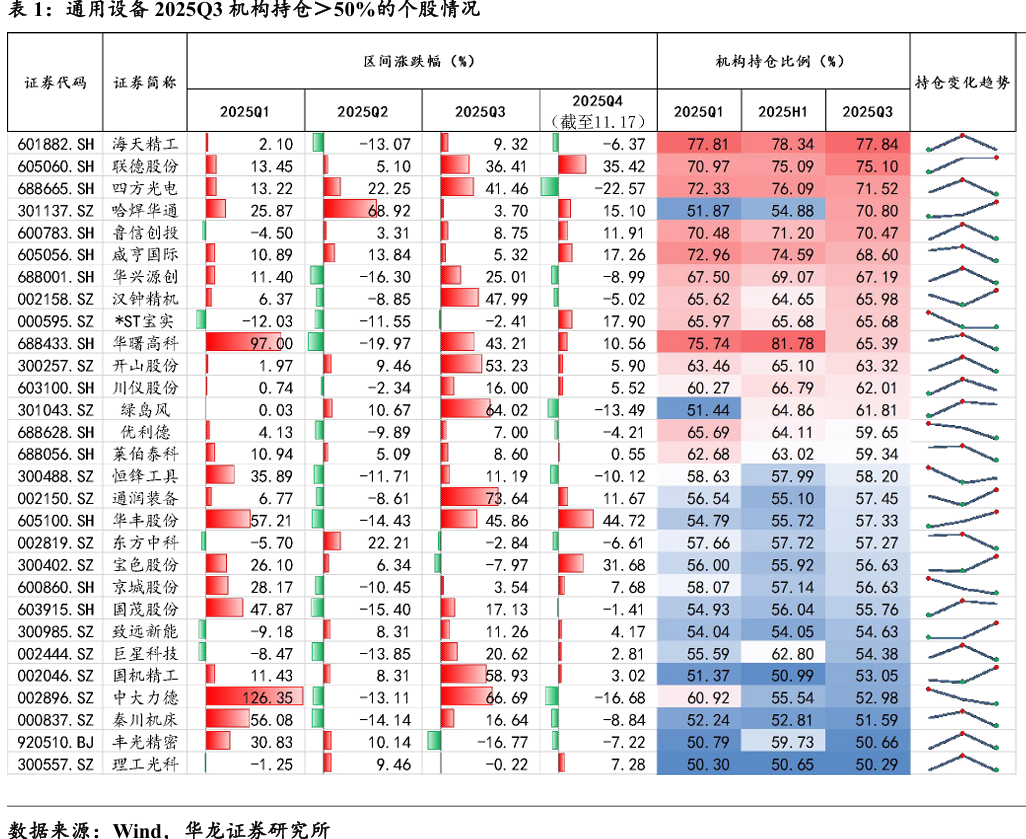2025年一季度,机构持仓前五个股为海天精工(77.81%)、华曙高科 (75.74%)、咸亨国际(72.96%)、四方光电(72.33%)、联德股份(70.97%); 二季度机构持仓前五个股为华曙高科(81.78%)、海天精工(78.34%)、四 方光电(76.09%)、联德股份(75.09%)、咸亨国际(74.59%);三季度机 构持仓前五个股为海天精工(77.84%)、联德股份(75.1%)、四方光电 (71.52%)、哈焊华通(70.8%)、鲁信创投(70.47%)。机构重仓股基本保 持稳定,三季度哈焊华通获机构增持。通用设备前三季度不断获得机构增 持的个股有联德股份、哈焊华通、通润装备、华丰股份、国机精工、*ST 威尔、美心翼申、航天动力、君禾股份、宝鼎科技等。