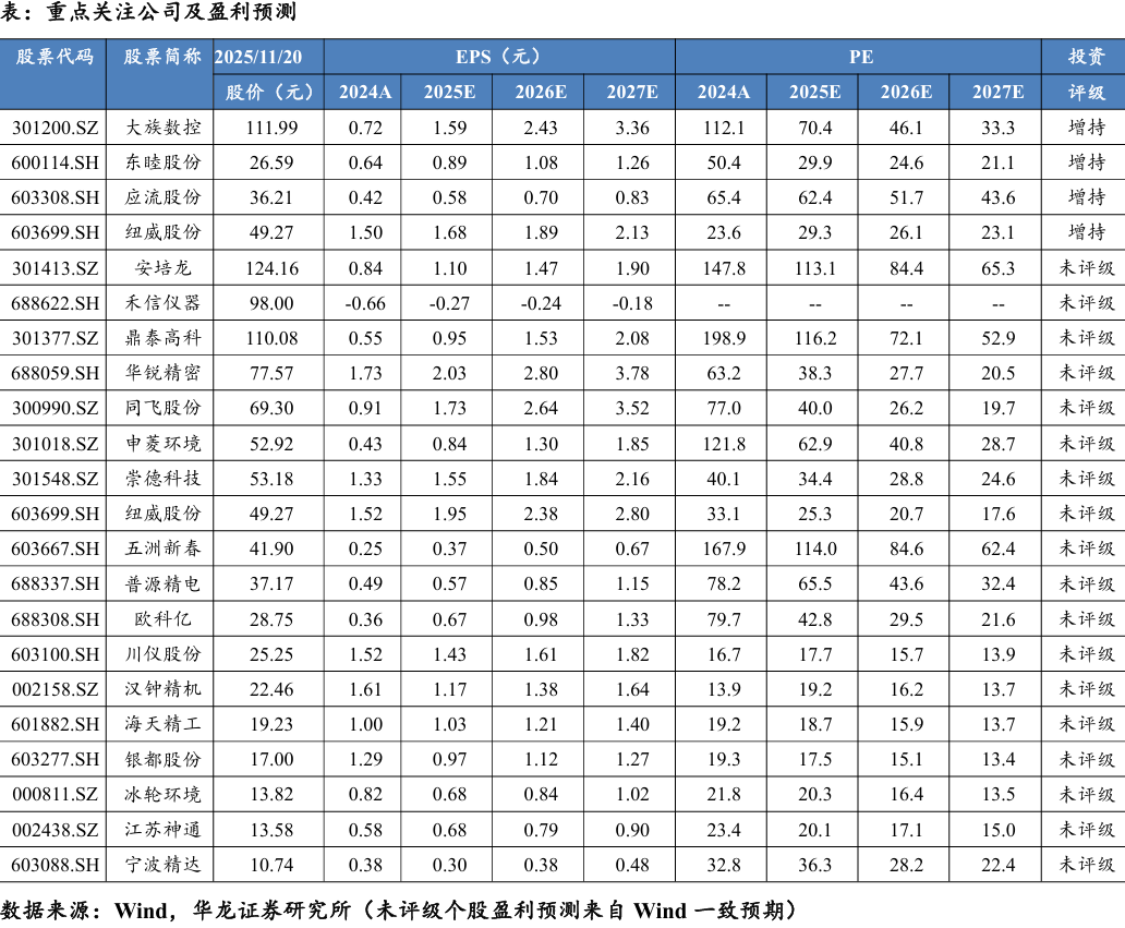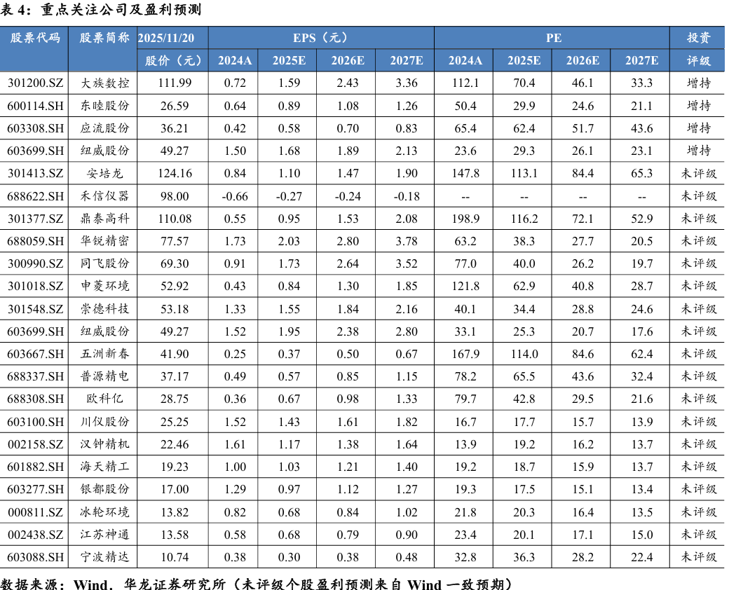 1)机床工具: 工业母机直接受益于制造业升级和设备更新政策。金属 切削机床的高增长和日本对华机床出口的持续增长,验证了高端市场需求 有所复苏,关注在新能源汽车、航空航天等领域有广泛应用的五轴联动、 高精度机床制造商海天精工(601882.SH)、纽威数控(688697.SH)、大族 数控(301200.SZ)、宁波精达(603088.SH)等;碳化钨价格上涨虽带来成 本压力,但有利于拥有核心技术、具备成本传导能力的中高端龙头企业集 中度提升。重点关注产品定位高端、客户粘性强的刀具公司欧科亿 (688308.SH)、华锐精密(688059.SH)等。