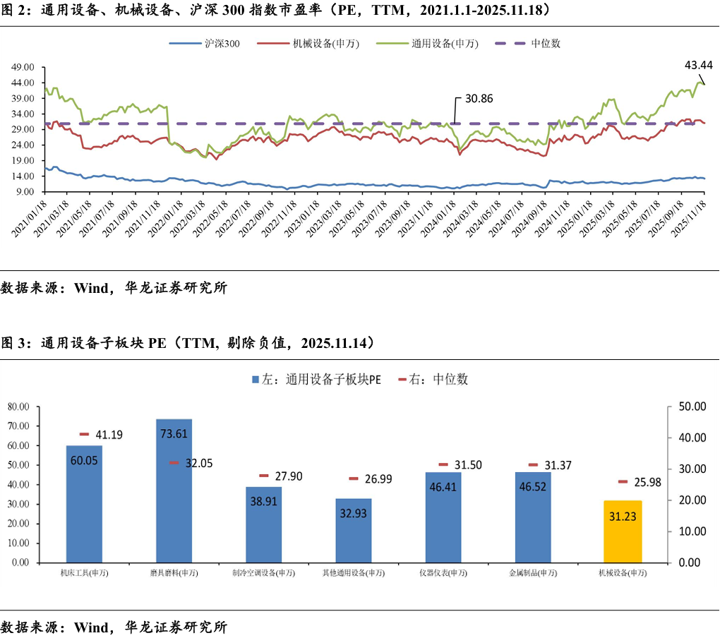 2025年11月18日,SW通用设备板块市盈率(TTM,剔除负值)为 43.44,同期机械设备行业市盈率(TTM,剔除负值)为31.05,沪深300 指数为13.27。2021年至今(截至11.18日),通用设备板块PE(TTM,剔 除负值)超出中位数(30.86)40.78%。 通用设备子板块PE(TTM,剔除负值)/超出2021年至今中位数的百 分比分别为:其他通用设备(32.93/22.03%)、制冷空调设备(38.91/39.45%)、 机床工具(60.05/45.8%)、仪器仪表(46.41/47.34%)、金属制品 (46.52/48.27%)、磨具磨料(73.61/129.64%)。可以看出行业整体估值已 有所修复,子板块分化明显,其他通用设备、制冷空调设备、机床工具的 估值相对于自身历史水平仍不算极端,具备更好的安全边际和上行空间。
