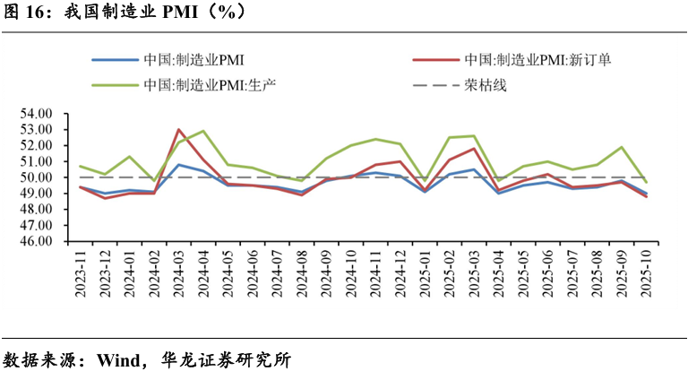 受到短期季节性因素和外部环境复杂性的影响,2025年10月我国制 造业PMI为49%,同比-1.1pct,环比-0.8pct,制造业景气水平有所回落。 制造业生产PMI49.7%,同比-2.3pct,环比-2.2pct。主要因为“十一” 假期前部分需求已提前释放,加之国际环境复杂,企业生产活动有所放缓。 制造业新订单PMI48.8%,同比-1.2pct,环比-0.9pct;需求的收缩与生 产放缓形成呼应,共同拉低了整体指数,出口下滑是拖累需求的重要因素。