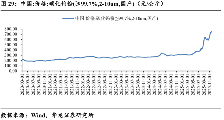 碳化钨是制造硬质合金刀具(如车刀、铣刀、钻头)的核心原材料, 成本占比较高。2025 年初起,钨价涨势强劲,国产碳化钨粉((≥ 99.7%,2-10um)价格从年初308.5 元/公斤飙升至760元/公斤(2025年11.21 日)。