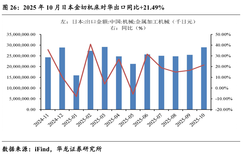 2025年10月日本金属加工机床对华出口290.03亿日元,同比+21.49%, 已连续五个月同比双位数正增长。中国市场汽车零部件、半导体与电子设 备相关需求普遍回暖。