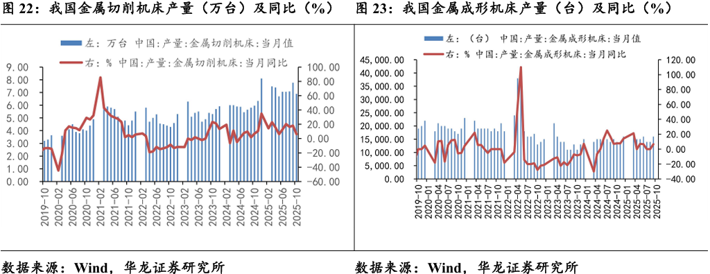 其中 10月金属切削机 床产量7万台,同比增加6.2%,连续十六个月保持正增长。 2025 年1-10 月金属成形机床累计产量14.6万台,同比增长8.1%,增 速较1-9月增加0.8pct。其中10月金属成形机床产量1.4万台,同比持平。