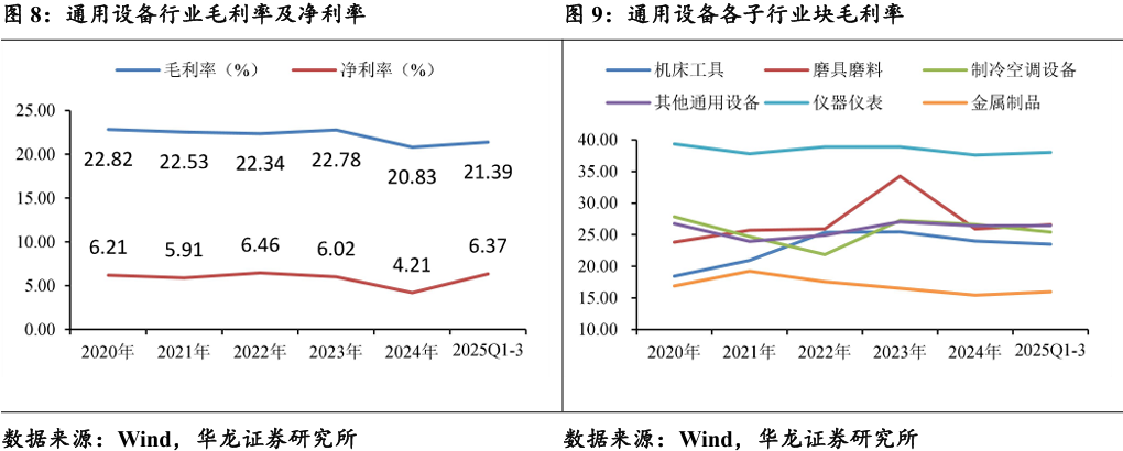 前三季度盈利能力较2024年有所改善,其他通用设备及磨具磨料表 现较好。2025年前三季度通用设备毛利率21.39%,净利率6.37%,较2024 年全年改善明显。 单三季度,实现毛利率21.53%,同比+0.25pct,环比-0.38pct;实现净 利率6.16%,同比+0.02pct,环比-0.99pct。子行业中仅其他通用设备三季 度毛利率同环比提升,磨具磨料毛利率同比+2.73pct改善明显。①仪器仪 表作为高壁垒、高附加值领域的代表,毛利率长期稳定在绝对高位;②金 属制品等传统领域则长期在低毛利区间挣扎,受原材料和供需周期影响显 著;③磨具磨练毛利率波动较为剧烈,我们预计与原材料价格上涨相关, 磨具磨料作为生产耗材,龙头企业具备较强的成本传导能力。上半年碳化 钨等原材料价格上涨,相关企业将上涨成本顺利转嫁下游,导致毛利率同 比提升较多。
