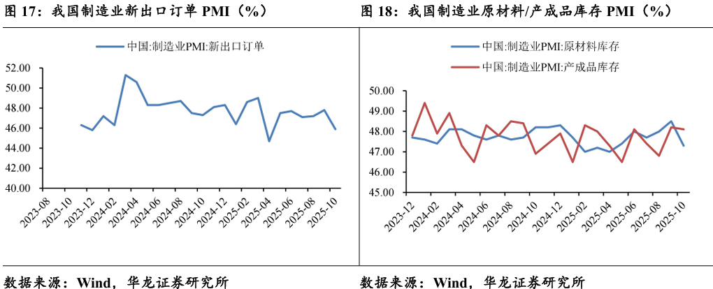 2025 年 10 月新出口订单指数降至45.9%,为年内次低点,装备制造 业、高技术制造业和消费品制造业的出口均较上月明显收紧。 2025 年10月原材料库存指数为47.3%,环比-1.2pct,表明企业采购意 愿减弱,主动减少了原材料的储备。产成品库存指数为48.1%,环比-0.1pct, 产成品库存的略微减少,预计与销售消耗及企业调整生产计划有关。