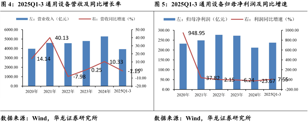 业绩表现:业绩表现分化,盈利显著改善。通用设备整体营收微降,但盈利显著改善。 2025 年前三季度通用设备板块共实现营业 收入3927.02 亿元,同比-1.15%;实现归母净利润237.25亿元, 同比+7.55%。通用设备内部呈结构性变化,高附加值、与产业升 级相关的子板块(仪器仪表、机床工具)表现较好,传统、周期性较强的子板块(金属制品、磨具磨料)继续承压。