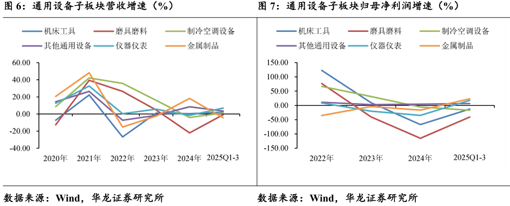 营收端:营收下降主要是受金属制品及磨具磨料影响,其他板块营收 均录得上涨。2025年前三季度通用设备子板块营收增速由高到低分别为仪 器仪表(+6.93%)、其他通用设备(+3.53%)、机床工具(+2.12%)、制冷 空调设备(+1.37%)、磨具磨料(-0.9%)、金属制品(-4.33%)。