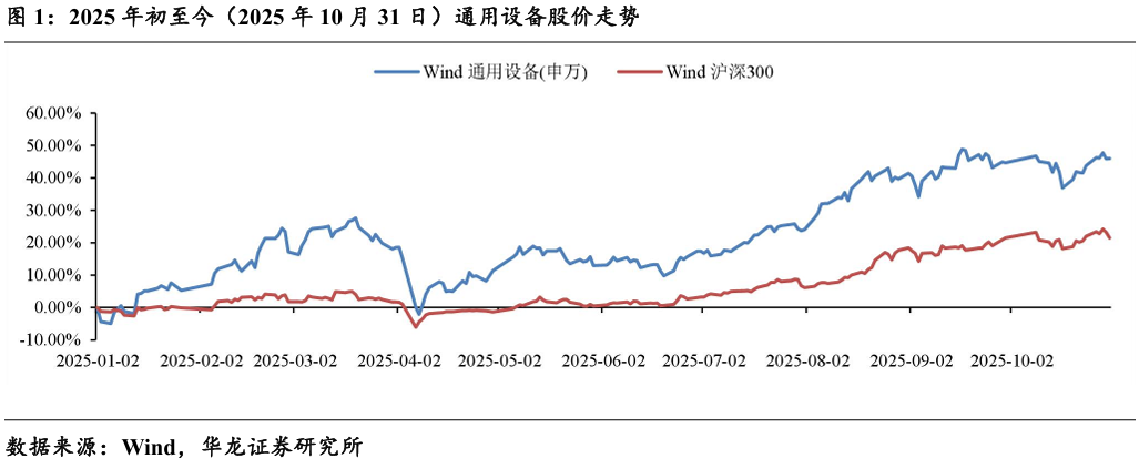 2025 年初至10月31日,通用设备指数(801072.SI)上涨46.05%, 同期沪深300指数上涨21.47%,相对收益24.58%,整体表现优于沪深300。 指数区间最高涨幅71.94%,高于沪深300区间最高涨幅35.51%。区间最 大跌幅-11.74%,低于沪深300区间最大跌幅-2.54%,行业指数较沪深300 波动更大。