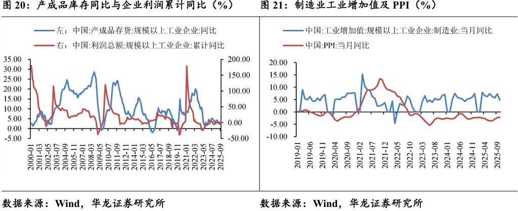 2025 年1-9,规模以上工业企业利润总额累计同比+3.2%,增速较1-8 月进一步扩大,企业盈利正在加速恢复。同时,规模以上工业企业产成品 库存维持相对低位,整体呈现“利润增、库存稳”现状,预示经济活动可能 在回暖中。 2025 年 10 月,制造业工业增加值同比+4.9%,保持稳定;PPI(工业 产品出厂价格)当月同比-2.1%,降幅持续收窄。企业销售产品的“量”和 “价”都在改善。