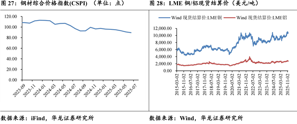 钢铁、铝、铜等是通用设备重要的原材料。2025年7月,钢材综合价 值指数为95.87,同比下降1.16%,2025年以来,钢材价格指数维持低位 运行。2025年11月20日,LME铜现货结算价10789美元/吨,受到宏观 金融属性与商品属性的共同影响铜价高位运行;LME铝现结算价2778.5 美元/吨,需求增长供给有限导致铝价走强。