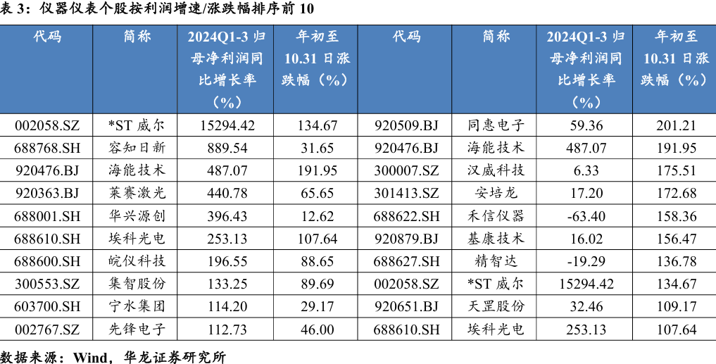 仪器仪表量利齐升,营收增长带动规模效应,同时其高技术壁垒带来 了较高的定价权和利润率,利润增速远超营收增速。仪器仪表利润增速 (+17.69%)较高,主要受益于*ST威尔(002058.SZ)、容知日新(688768.SH)、海能技术(920476.BJ)、莱赛激光(920363.BJ)、华兴源创(688001.SH) 等公司业绩改善。前三季度涨幅居前的个股多为人形机器人、存储设备、 量子科技等概念。