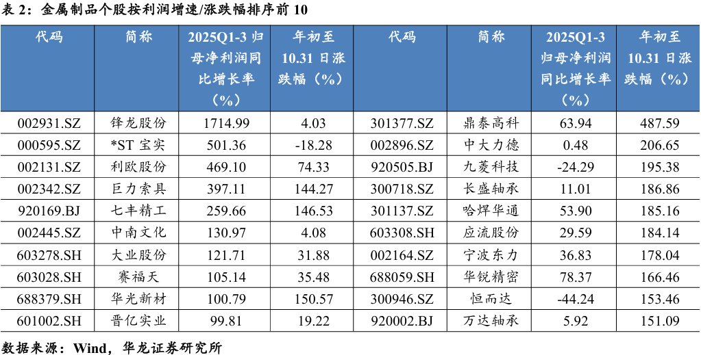 1)金属制品:显著受益于钢材价格低位运行的“成本红利”,利润改善 明显。需甄别其业绩改善的可持续性。优先选择下游需求稳定(如与新能 源、电力、高端装备相关),且自身具备产品升级能力的细分龙头纽威股份 (603699.SH)、东睦股份(600114.SH)、五洲新春(603667.SH)、应流股 份(603308.SH)、江苏神通(002438.SZ)、鼎泰高科(301377.SZ)、崇德 科技(301548.SZ)等。