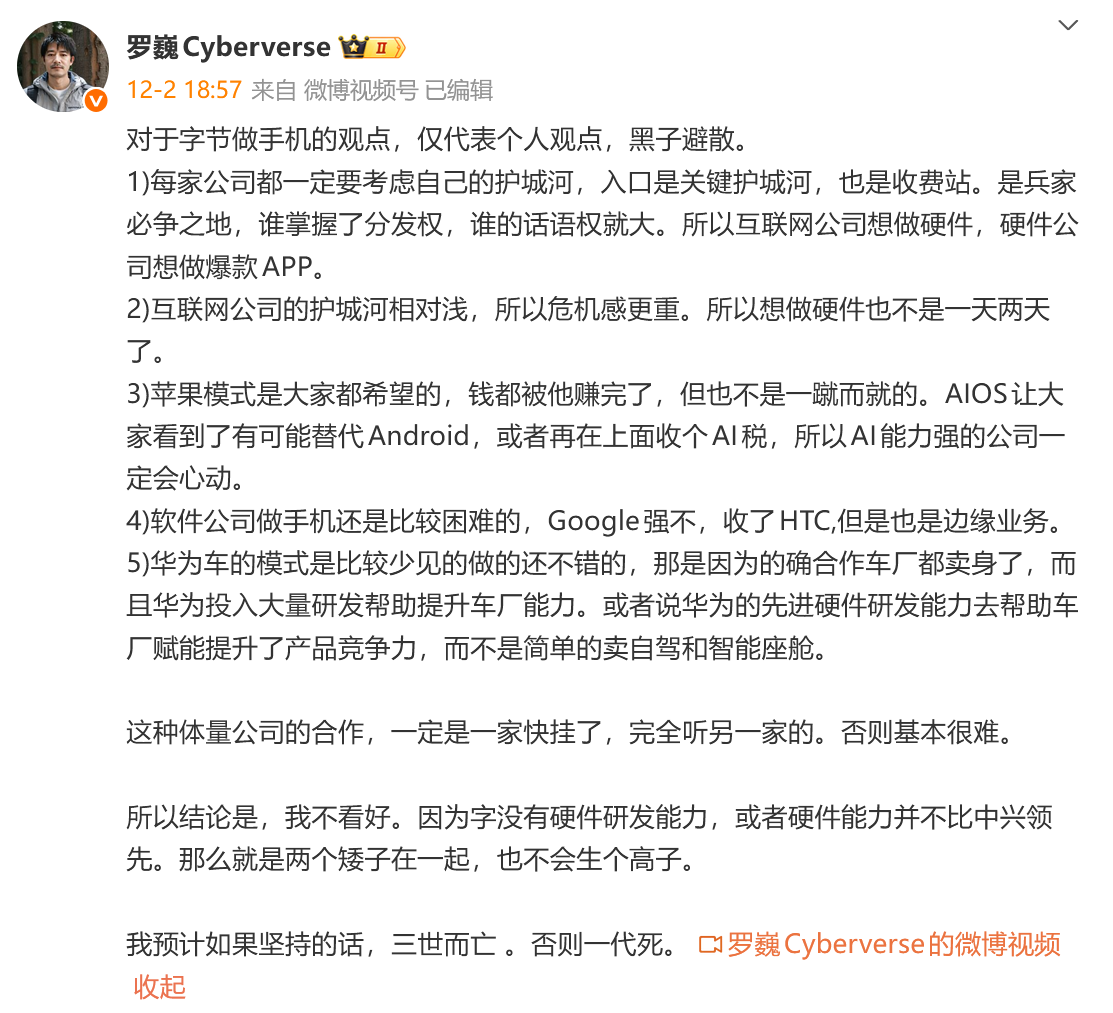 罗巍还提到,豆包手机与华为“智选车”模式有所不同,“这种体量公司的合作,一定是一家快挂了,完全听另一家的。否则基本很难。”罗巍直言,对于豆包手机并不看好,“因为字节跳动没有硬件研发能力,或者硬件能力并不比中兴领先。我预计如果坚持的话,三世而亡。否则一代死。”