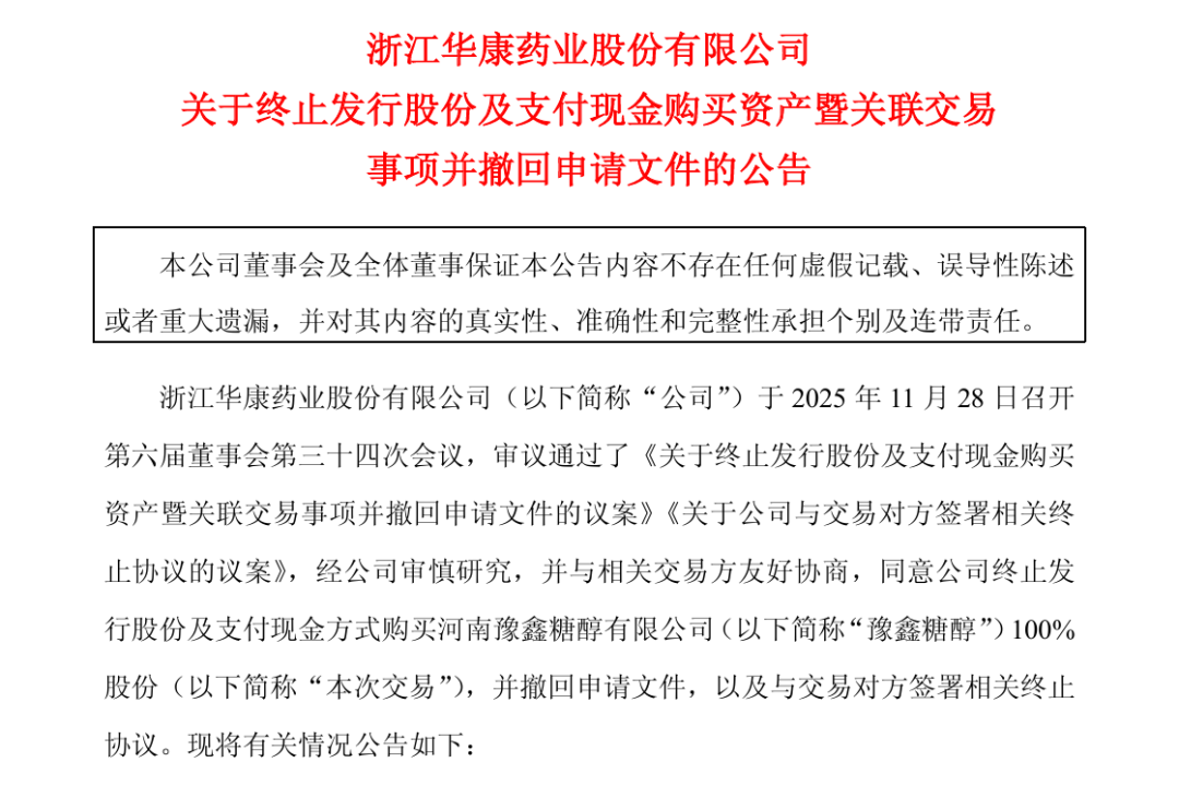 近日,浙江华康药业股份有限公司(证券简称:华康股份,沪市代码:605077)公告称,公司于11月28日召开第六届董事会第三十四次会议,同意公司终止发行股份及支付现金方式购买河南豫鑫糖醇有限公司(以下简称“豫鑫糖醇”)100%股份。