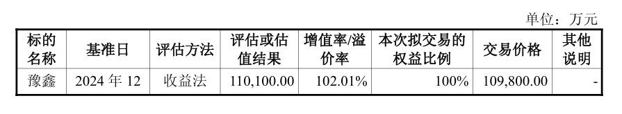 截至评估基准日(2024年12月31日),标的公司100%股权的评估值为11.01亿元,比截至2024年12月31日经审计的标的公司合并报表归属于母公司所有者权益增值5.56亿元,增值率为102.01%。