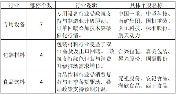 从行业特征来看,今日涨停板个股中,专用设备、包装材料、食品饮料行业的个股最多。
