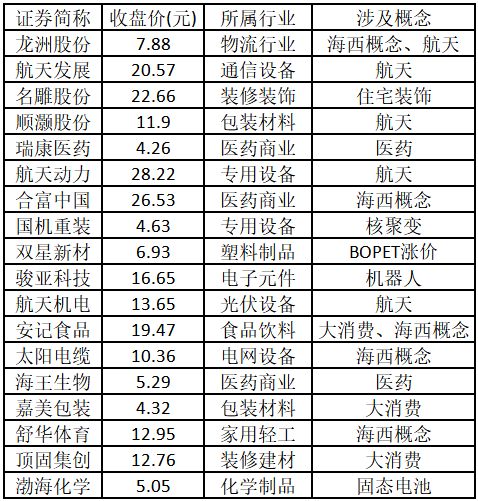涨停板个股中,股价创出近一年新高的个股有18只(不包括创出历史新高的个股),包括龙洲股份、航天发展、名雕股份、顺灏股份、瑞康医药、航天动力、合富中国、国机重装、双星新材、骏亚科技、航天机电、安记食品、太阳电缆、海王生物、嘉美包装、舒华体育、顶固集创、渤海化学,具体如下表所示。