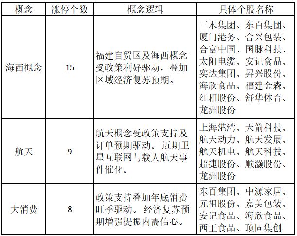 从概念特征来看,今日涨停板个股中,海西概念、航天、大消费概念的个股最多。