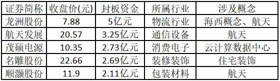 从封板资金来看,今日涨停板个股中,封板资金排名前5的个股包括龙洲股份、航天发展、茂硕电源、名雕股份、顺灏股份。